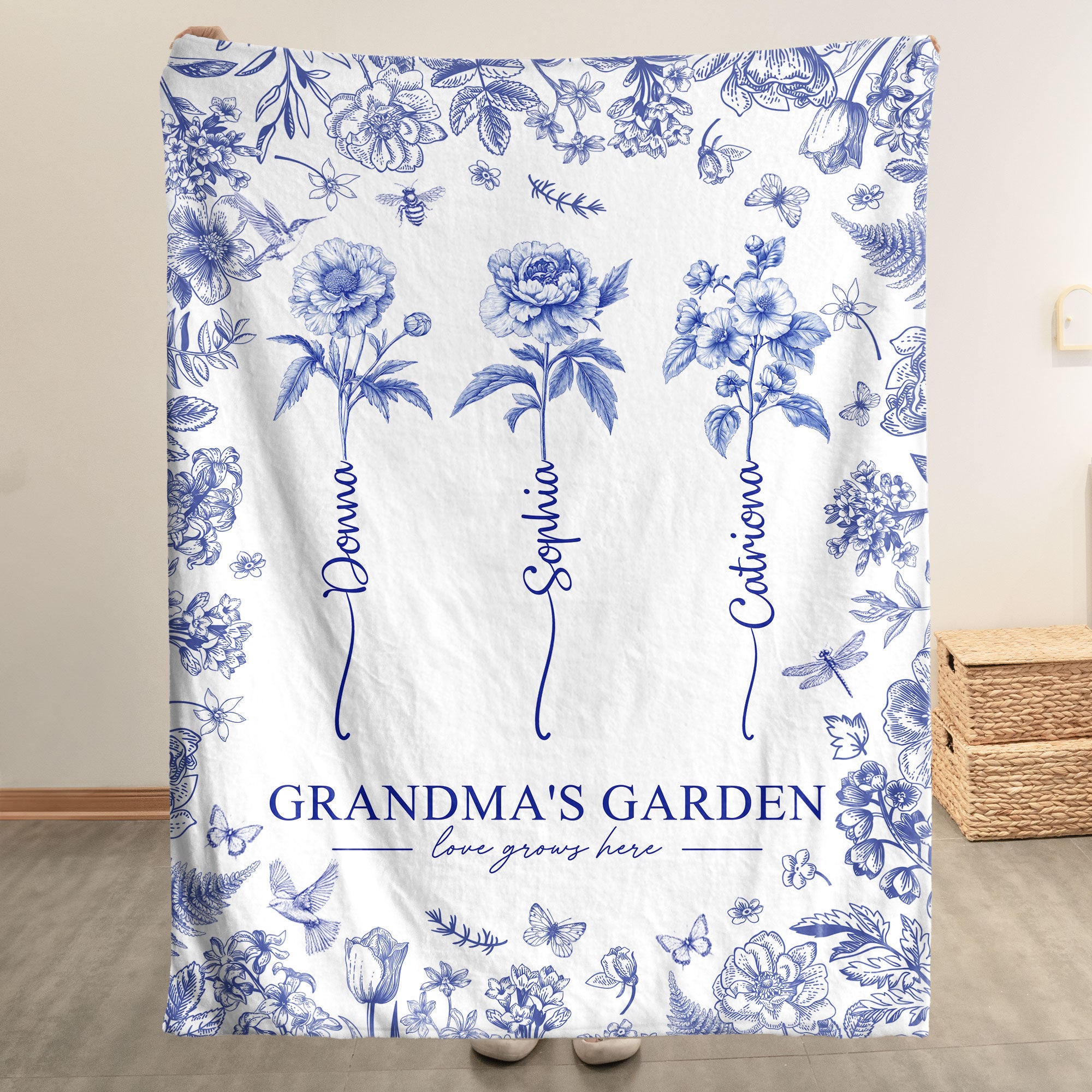 Grandma’s Garden – Custom Kids Birth Flower Toile De Jouy – Personalized Blanket Big Size