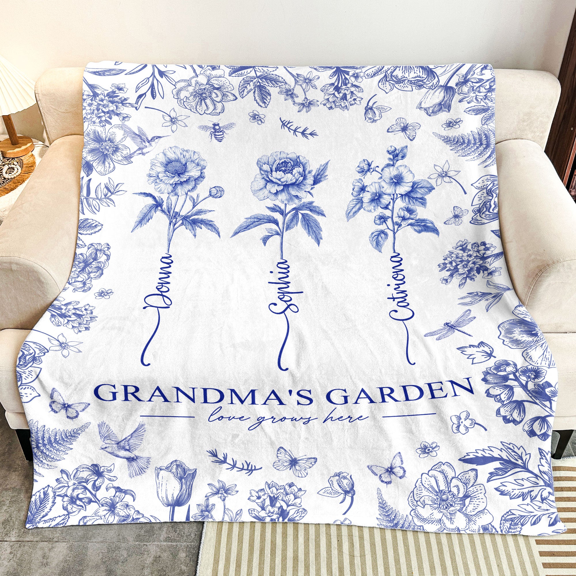Experience the sense of comfort and warmth in our one-of-a-kind Blanket, named “Grandma’s Garden – Custom Kids Birth Flower Toile De Jouy”. This isn’t just a blanket, it represents an unspoken bond between a grandmother and her family, resembling their love, mutual respect, and time spent together. It becomes a medium of expressing the intrinsic word – “Love Grows Here”. The floral patterns depict the birth flowers of your kids, allowing you to wrap yourself with the blossoming love in any season or time.