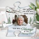 Honor a loved one’s memory with this touching personalized acrylic photo plaque. Featuring a puzzle piece design, it can be customized with the name and years of the person you’re memorializing as the missing piece in your life. The heartfelt message reads “You will always be our missing piece.” An uplifting bereavement gift, it provides a meaningful way to commemorate someone on occasions like Memorial Day, Christmas, Mother’s/Father’s Day, their birthday, or the anniversary of their passing. Give as a sympathy gift to grieving family or friends, memorializing someone such as a deceased parent, child, sibling, or friend. Designed to commemorate their life and legacy, this personalized plaque helps keep their memory shining bright. They may be gone but not forgotten, as you proudly display this “You Will Always Be Our Missing Piece” plaque in loving remembrance.